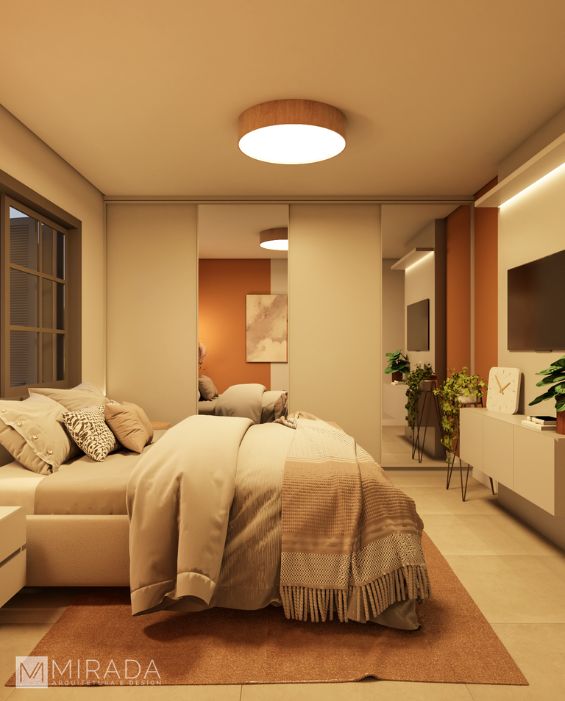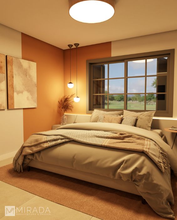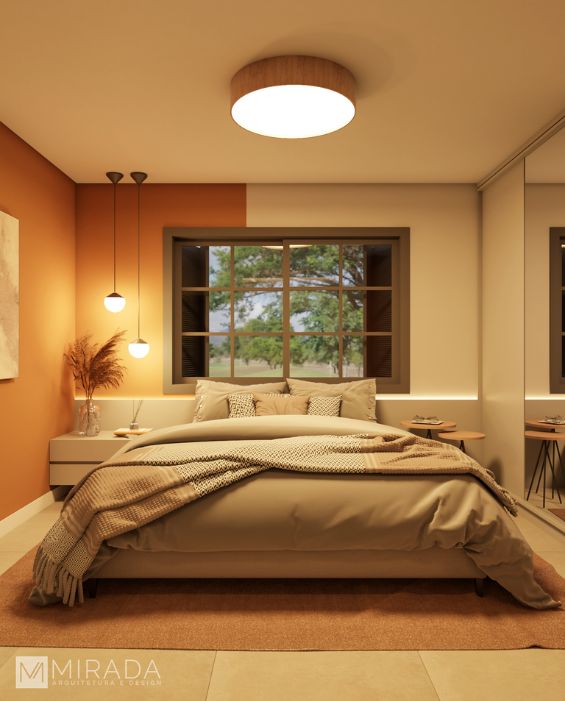 Com uma paleta envolvente de tons terrosos e iluminação suave, o Dormitório Casal Casa Aconchego foi pensado para acolher e transmitir tranquilidade. As paredes em pintura blocada, que mesclam o terracota ao off-white, criam um efeito visual aquecido e contemporâneo. O mobiliário clean, com espelhos que ampliam o espaço, e os elementos naturais, como plantas e têxteis com textura, reforçam o bem-estar no ambiente. A composição harmoniza funcionalidade e sensibilidade, resultando em um refúgio elegante e confortável para o casal.