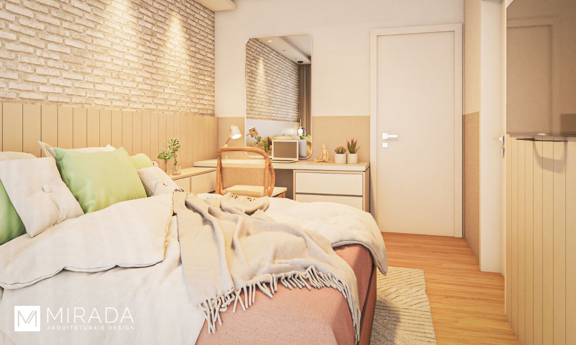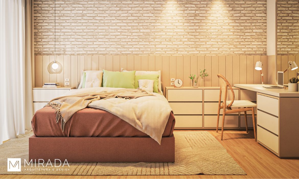 Com atmosfera serena e acolhedora, este dormitório combina texturas naturais e tons suaves para criar um refúgio de descanso e leveza. A parede em tijolinhos brancos harmoniza com o ripado em tom areia e o mobiliário clean, enquanto pontos de cor nos têxteis trazem frescor e personalidade ao ambiente. Uma proposta que equilibra funcionalidade e conforto com charme sutil.